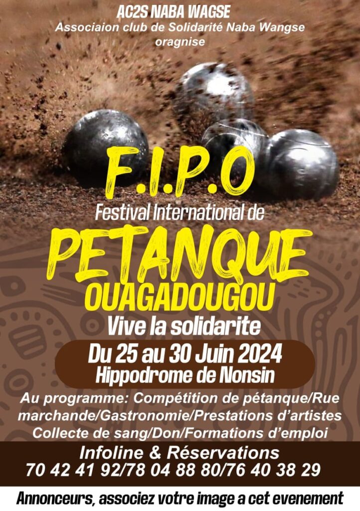 Venez vivre la solidarité au festival international de pétanque de Ouagadougou a l’hippodrome de Nonsin. Au programme : compétition de pétanque / Rue marchande / Gastronomie / prestation d’artiste / collecte de sang /Don / Formation d’emploi